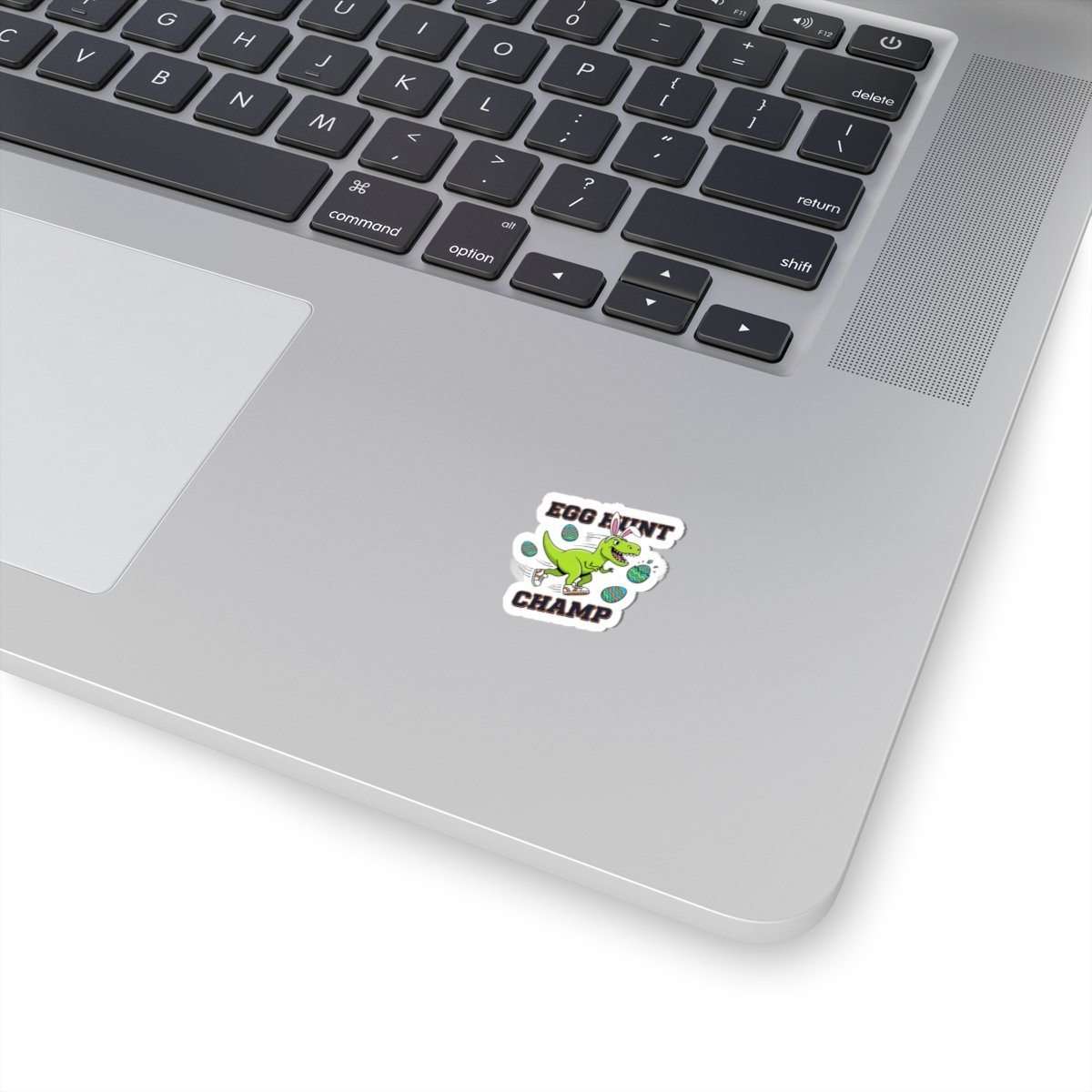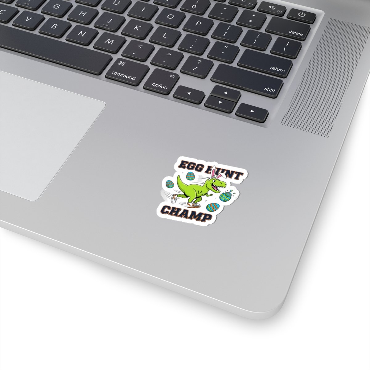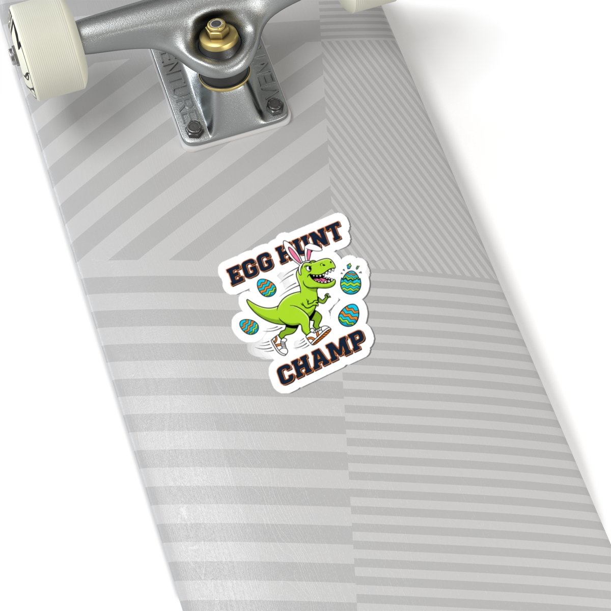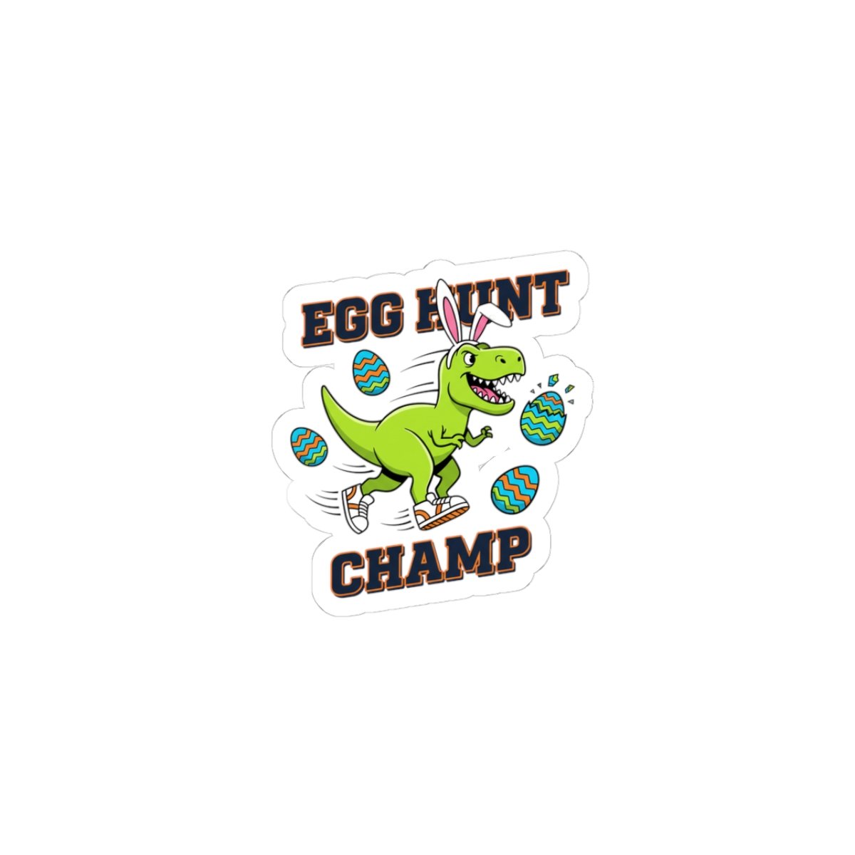 A punchy, playful sticker showing a confident green dinosaur wearing bunny ears and sneakers, mid-stride among patterned Easter eggs with chunky, high-contrast lettering reading “EGG HUNT CHAMP.” The art leans into bold kids’ Easter graphics—saturated greens and teals, thick type, and energetic motion—crafted to give boys a spirited, adventurous alternative to pastel motifs. Works as a standout accent on water bottles, laptops, journals, or kids’ gear to add a camo-free, action-focused Easter vibe.