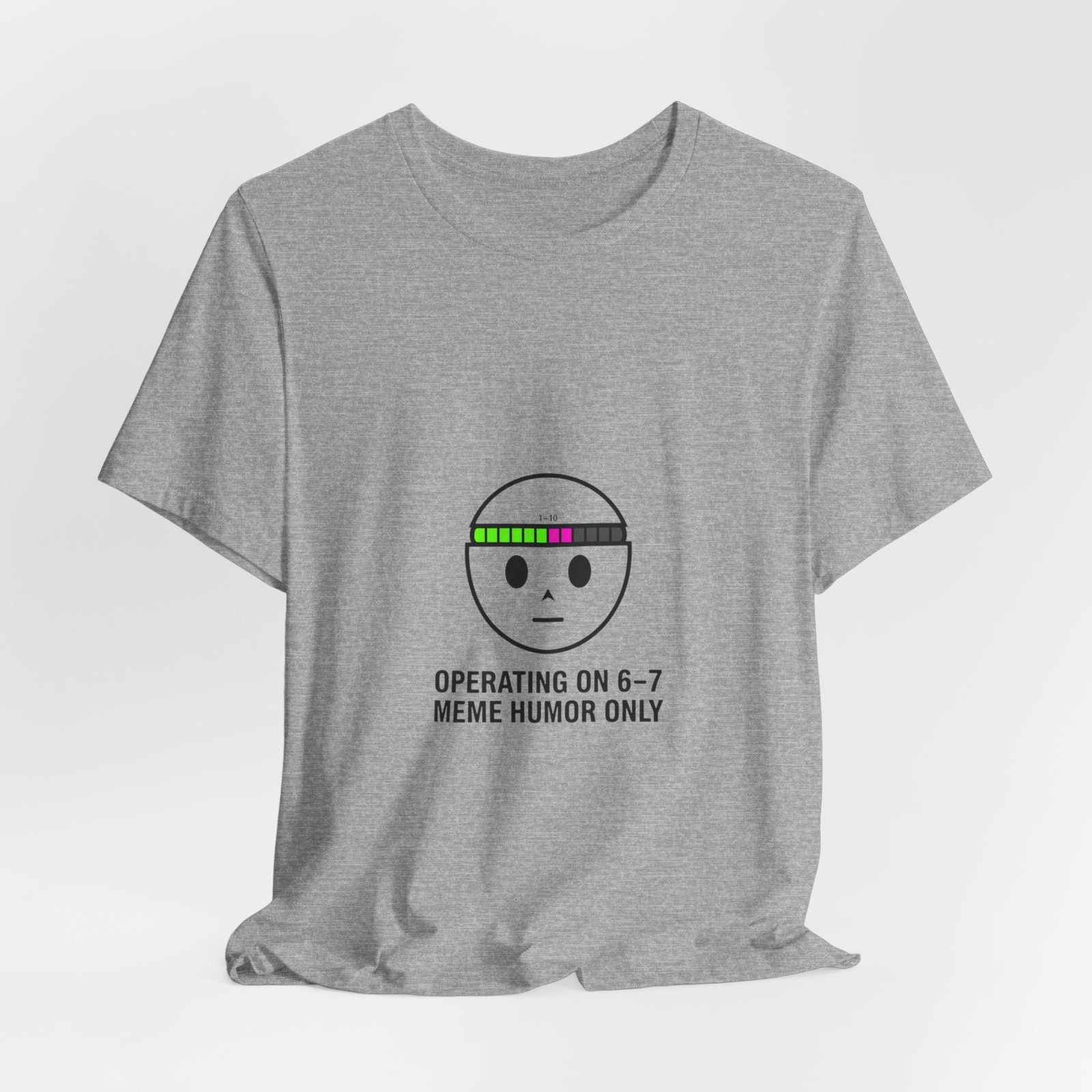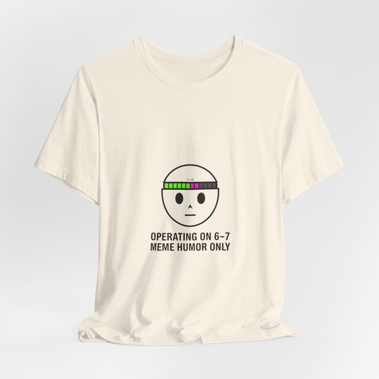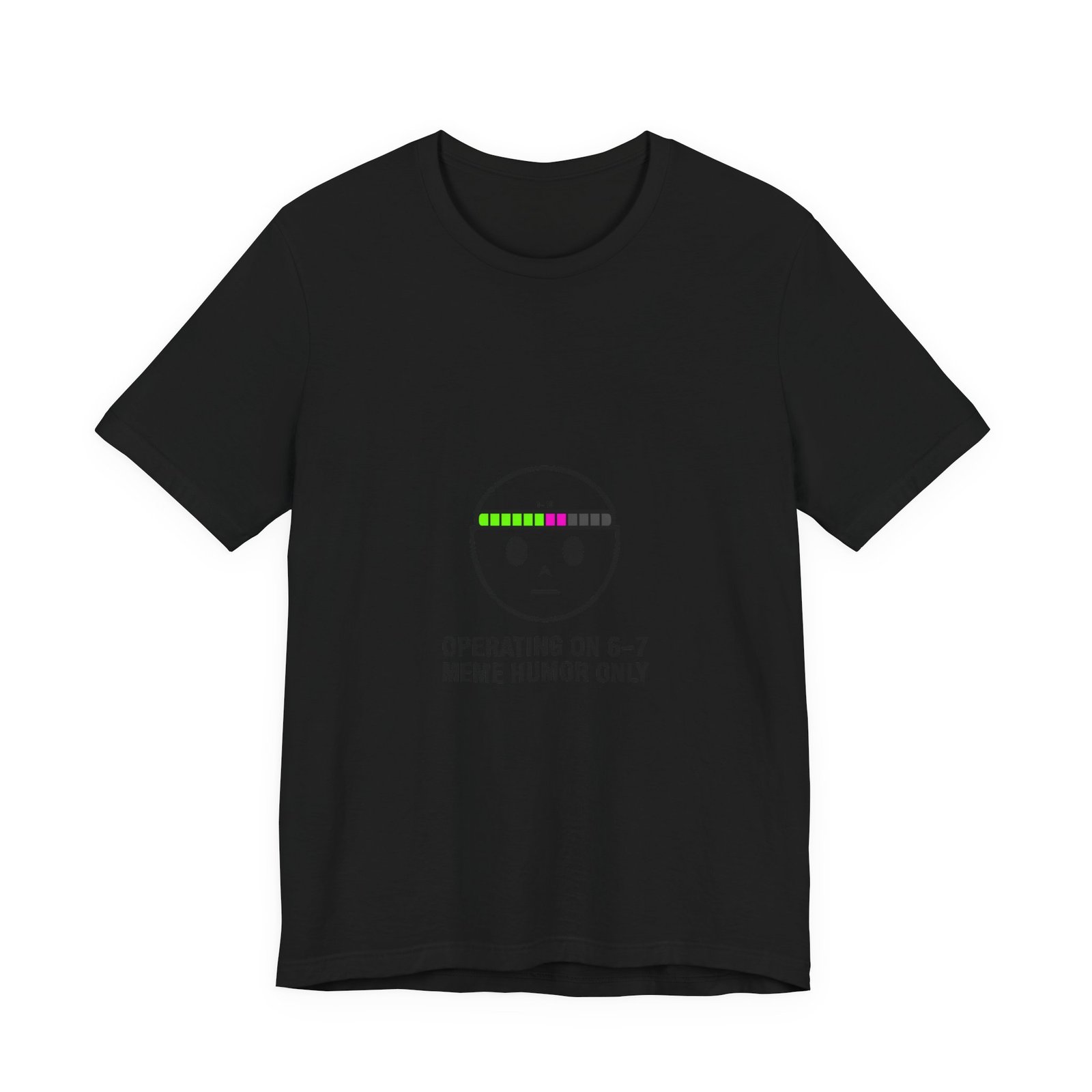 Deadpan numeric meme tee: a minimalist face icon with a retro bar of colored blocks above the brow and the cryptic line “OPERATING ON 6–7 / MEME HUMOR ONLY.” The small, athletic-style type and restrained palette read like an inside joke — familiar to meme-savvy viewers and quick to scan in feeds. Worn layered or solo, it signals surreal, absurdist humor with a low-key aesthetic that fits fast-moving TikTok meme cycles.