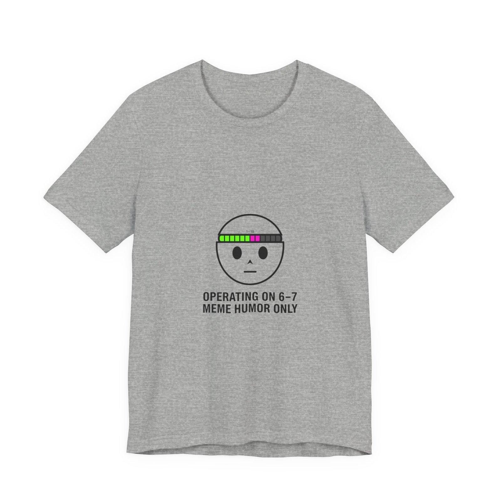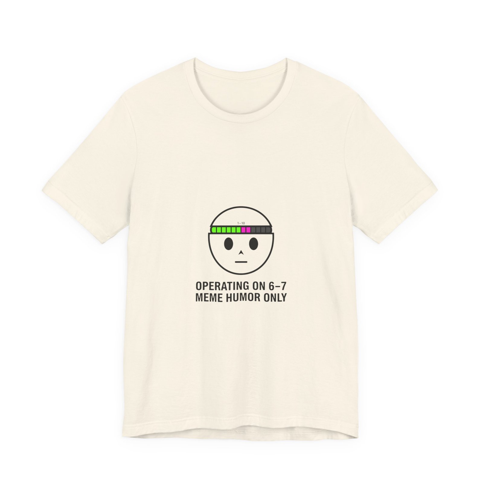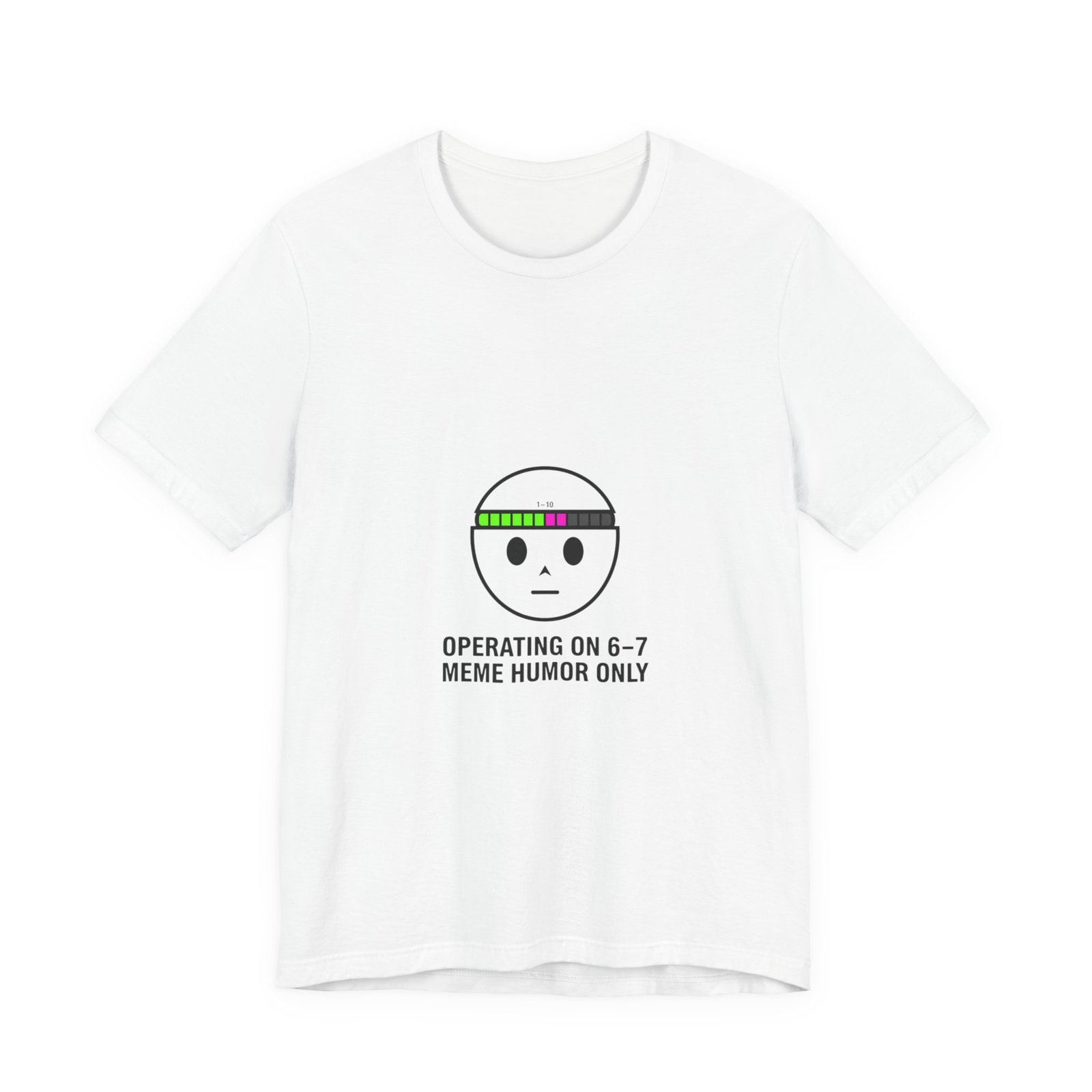 Deadpan numeric meme tee: a minimalist face icon with a retro bar of colored blocks above the brow and the cryptic line “OPERATING ON 6–7 / MEME HUMOR ONLY.” The small, athletic-style type and restrained palette read like an inside joke — familiar to meme-savvy viewers and quick to scan in feeds. Worn layered or solo, it signals surreal, absurdist humor with a low-key aesthetic that fits fast-moving TikTok meme cycles.